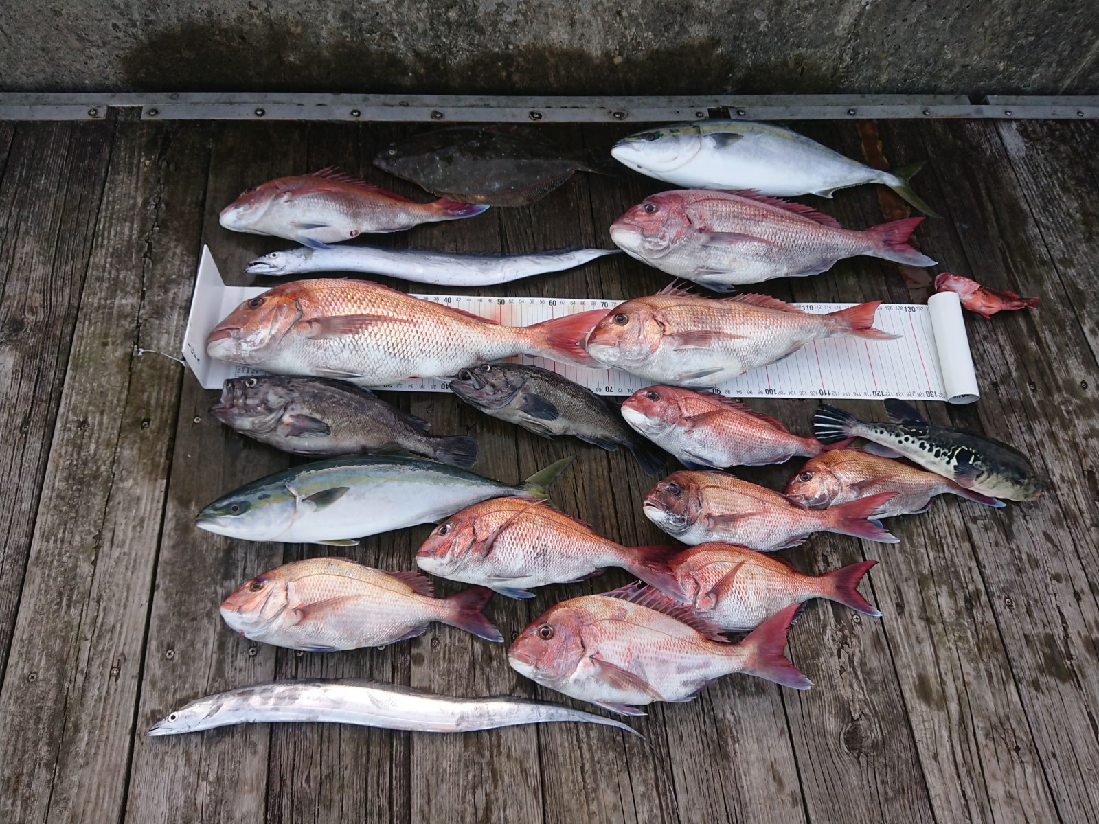 マダイ、5.3㎏頭、ワラサ4.9㎏、サバ、ソイ、ホウボウ、ヒラメ、カサゴ、タチウオ、トラフグ