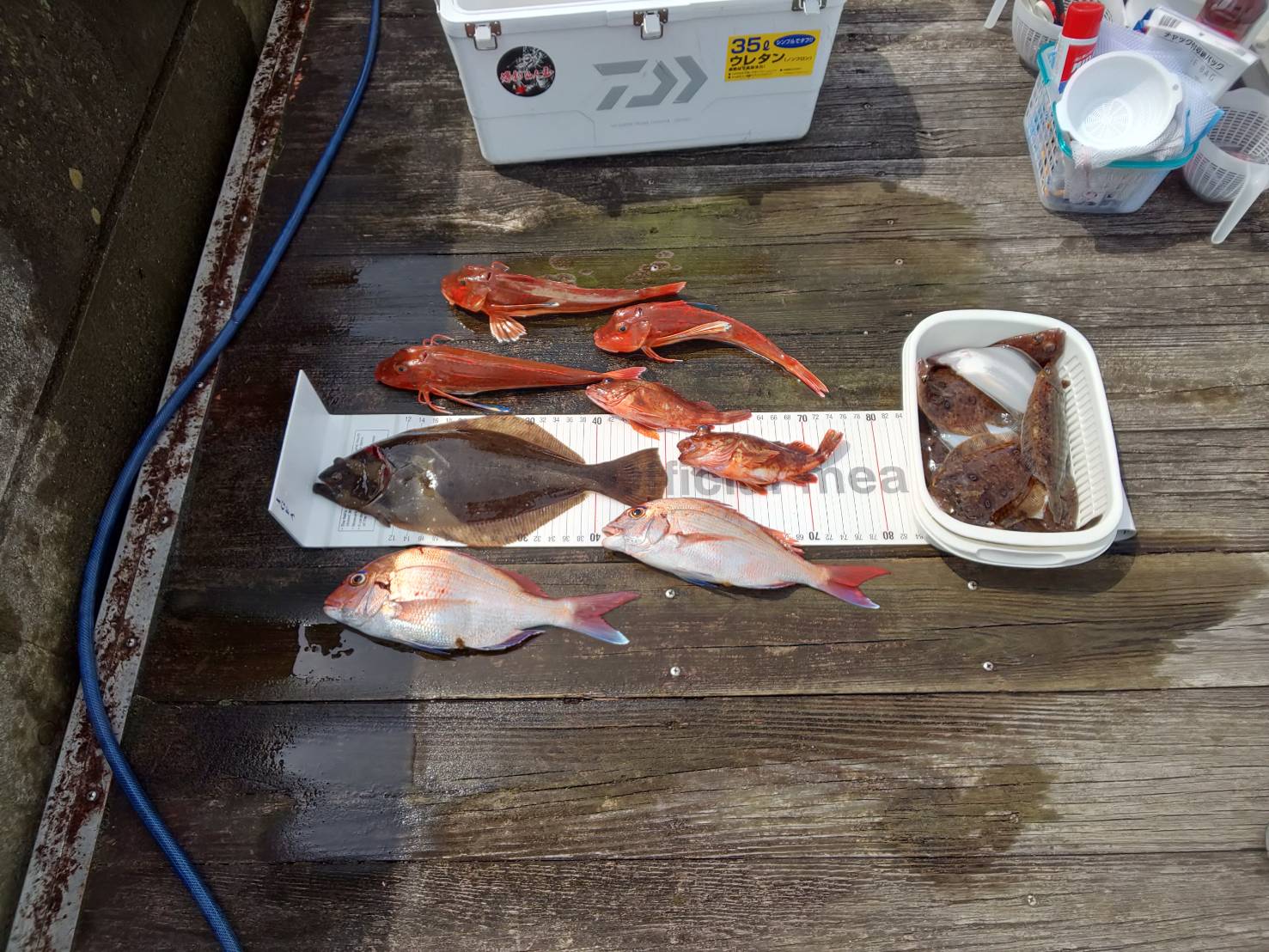マダイ、ヒラメ、ホウボウ、ムシガレイ、イナダ、カサゴ