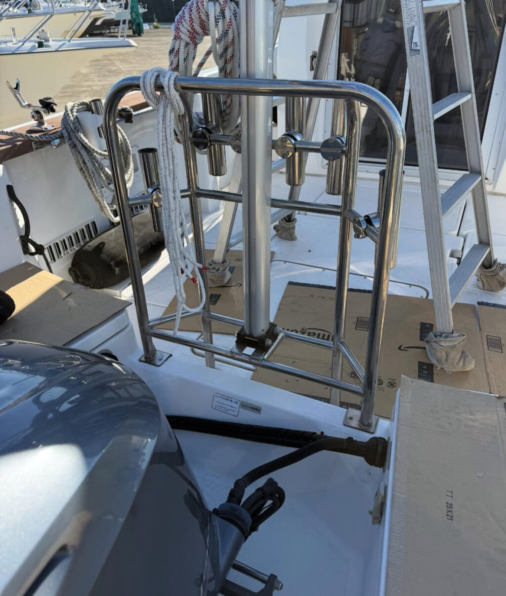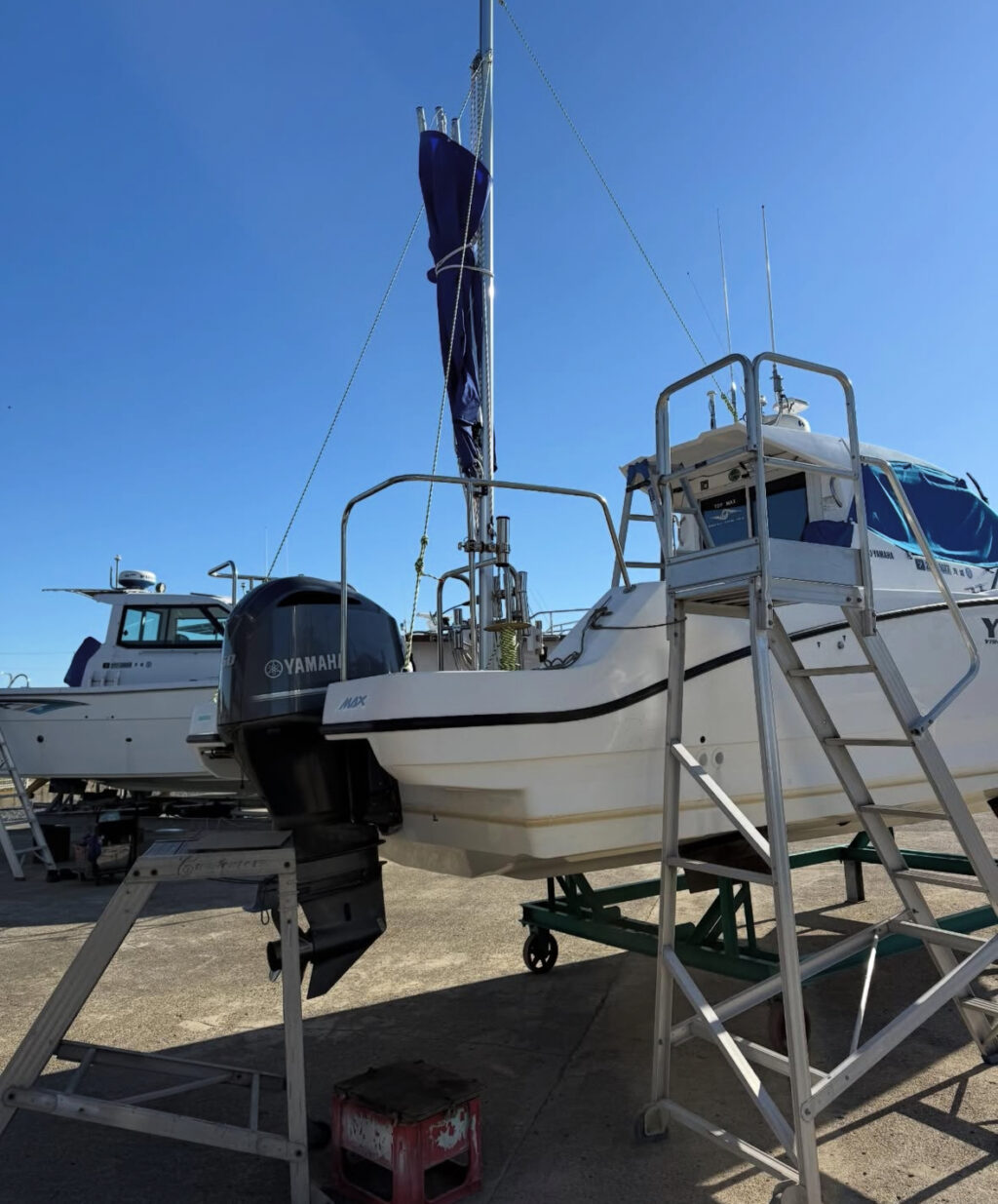 本日の作業は、マックスさんのスパンカーのお取り付け工事を行いました。船体に無駄な穴を開けず、きれいにまとまりました。