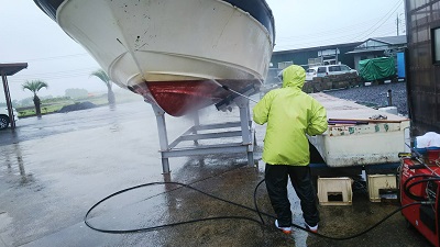 今日はお客様のご依頼により船を引き取りに行き船底塗装の為の下処理を行いました。