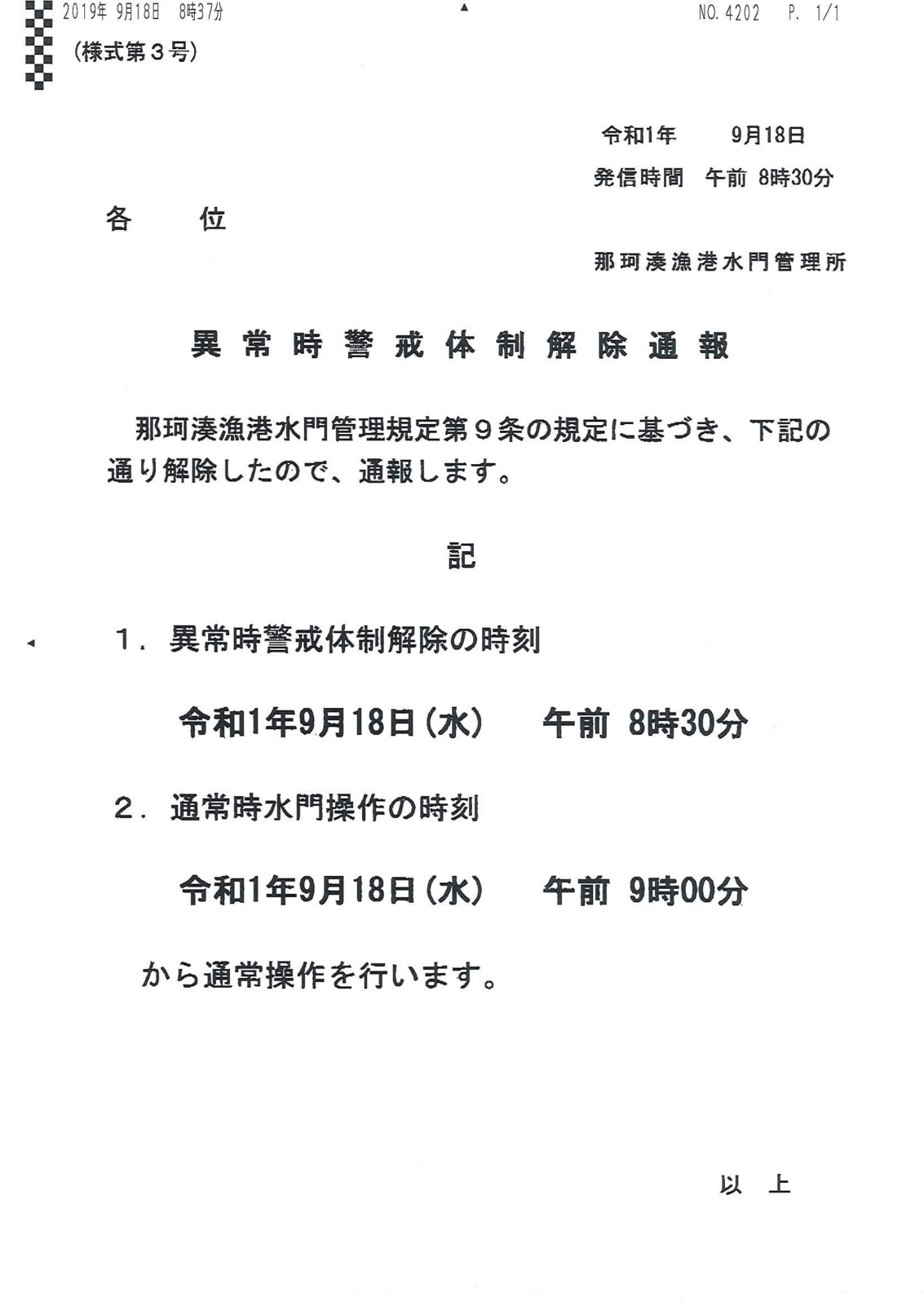 那珂湊漁港水門管理所より