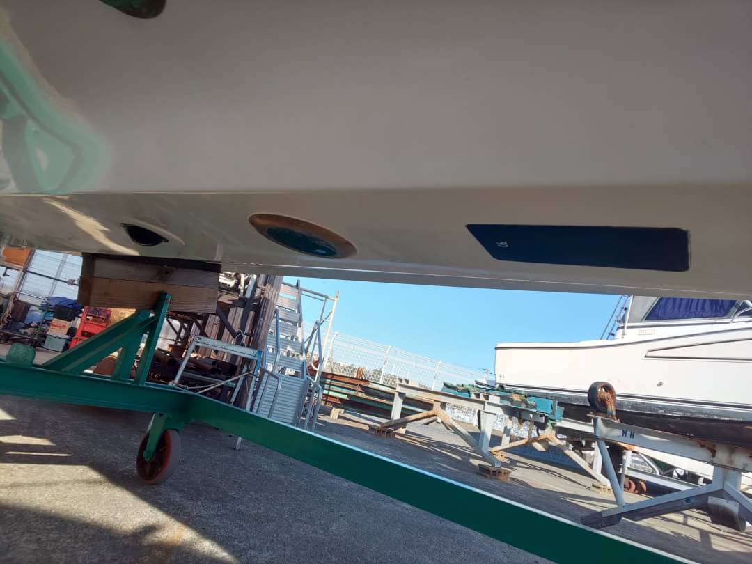 マックスさんの船底です。デジタル3kw振動子、チャープ振動子、ソナーを取り付けました。最新の艤装です。艤装等のご依頼お待ちしております。