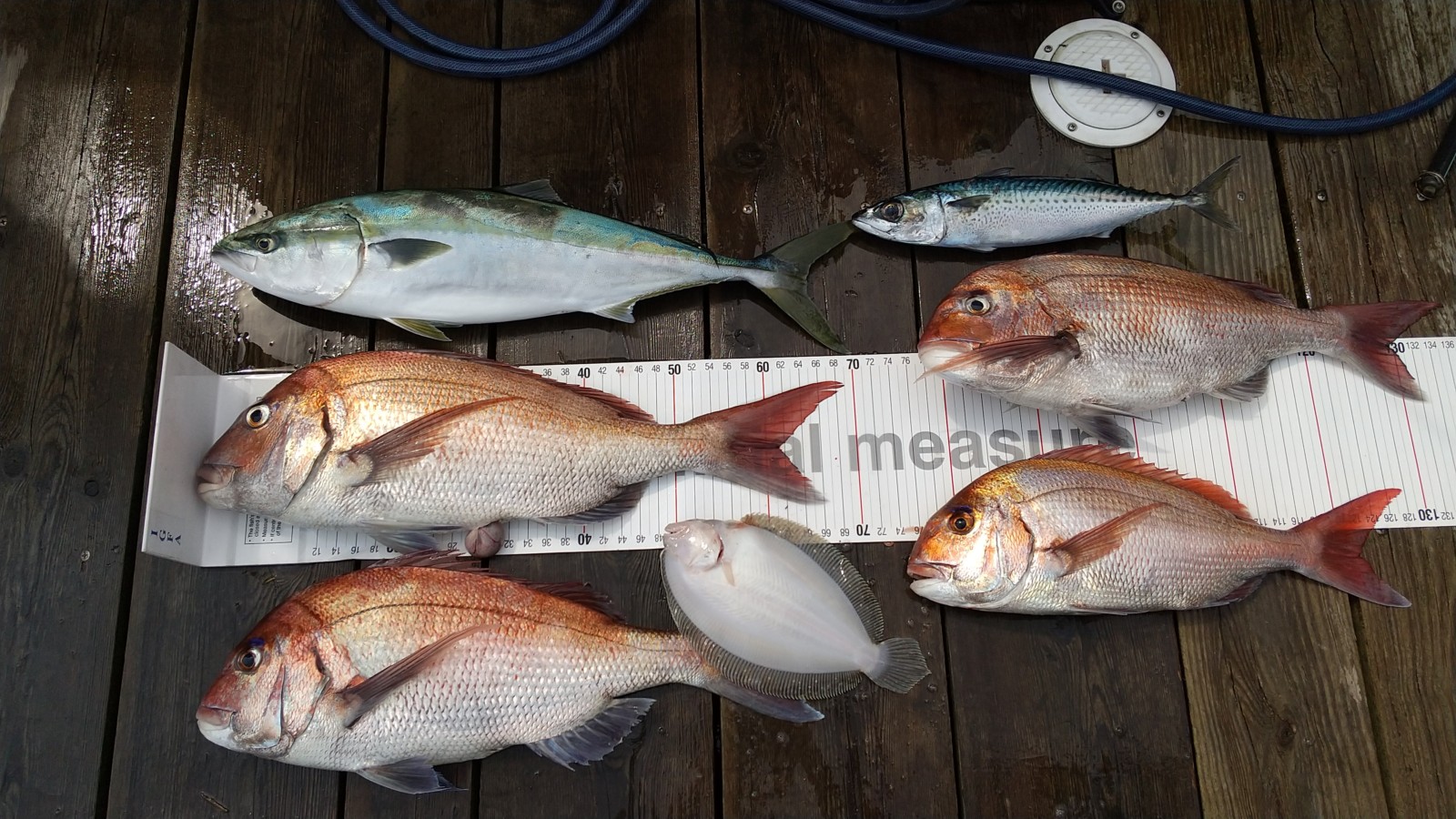 マダイ4.1キロ頭ガンゾウビラメ、ワラサ、サバ