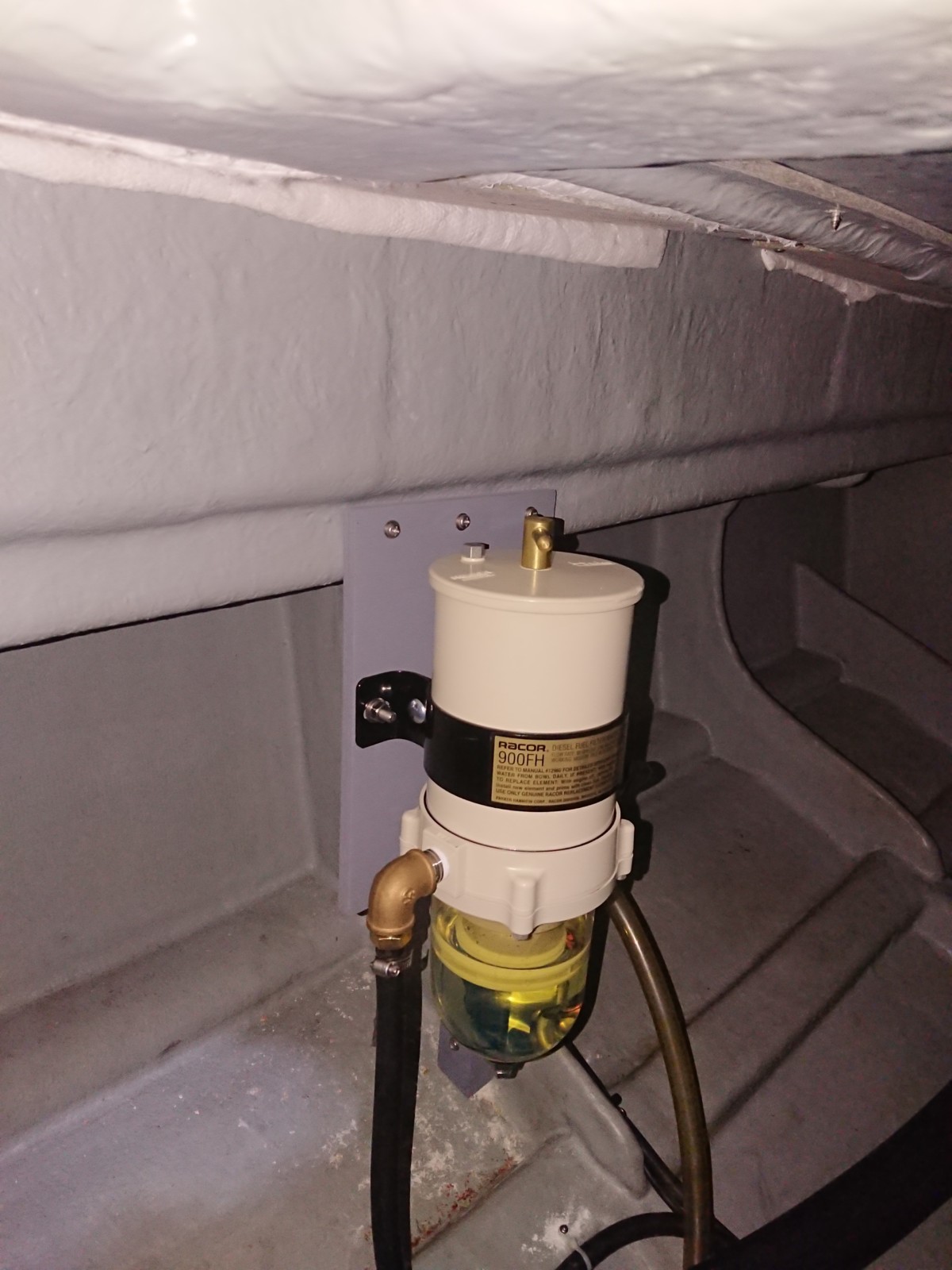燃料の油水分離器を取り付けました。燃料タンク側から流れてくる燃料をこのフィルターで濾過し、水分がエンジンまで行くことを防いでくれます。