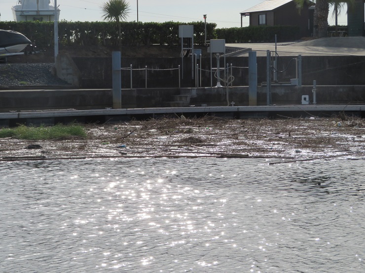 マリーナのドッグ内、涸沼川にも押し寄せています。