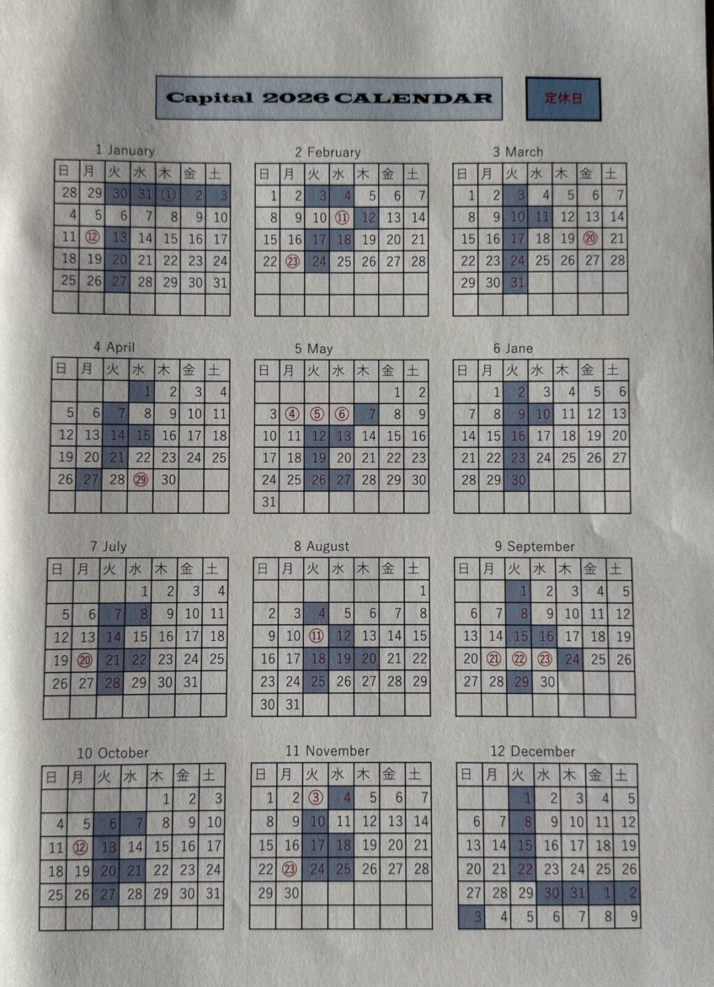 キャピタルの定休日のお知らせになります。ご確認お願い致します。