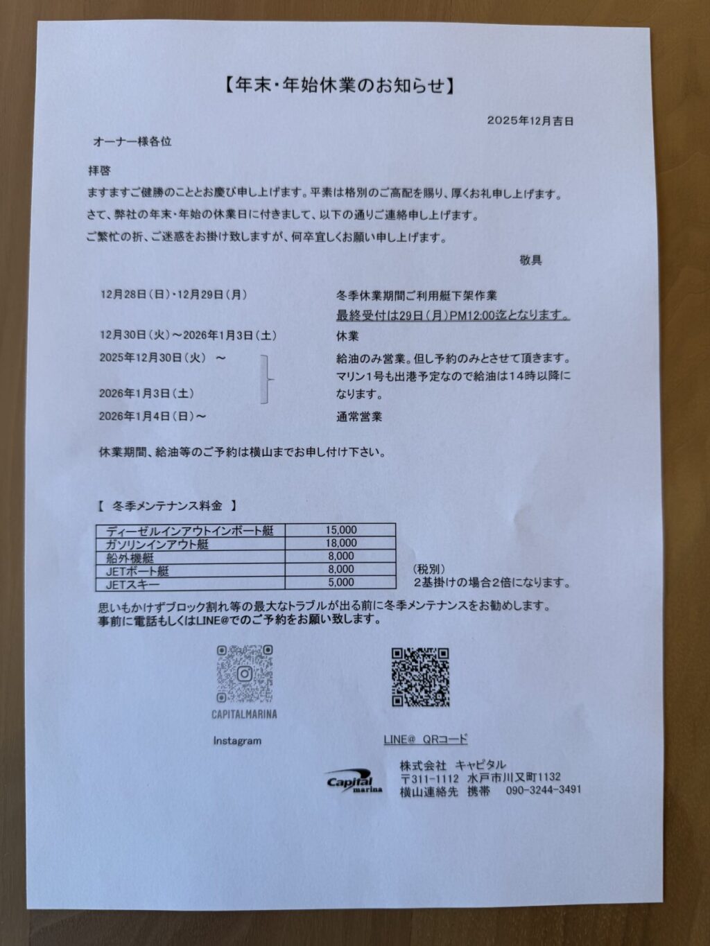 12月16日(土曜日)ボートをご利用のオーナー様は、誠に勝手ながら12月15日(金曜日)業務の都合上、上下架作業が出来ません。ご迷惑お掛け致しますが、12月14日、14時までに御予約をお待ちしております。