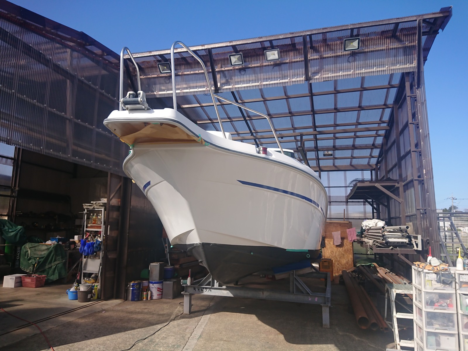 納艇前に船体の補修と磨きを行っています。もう少々お時間頂きます。