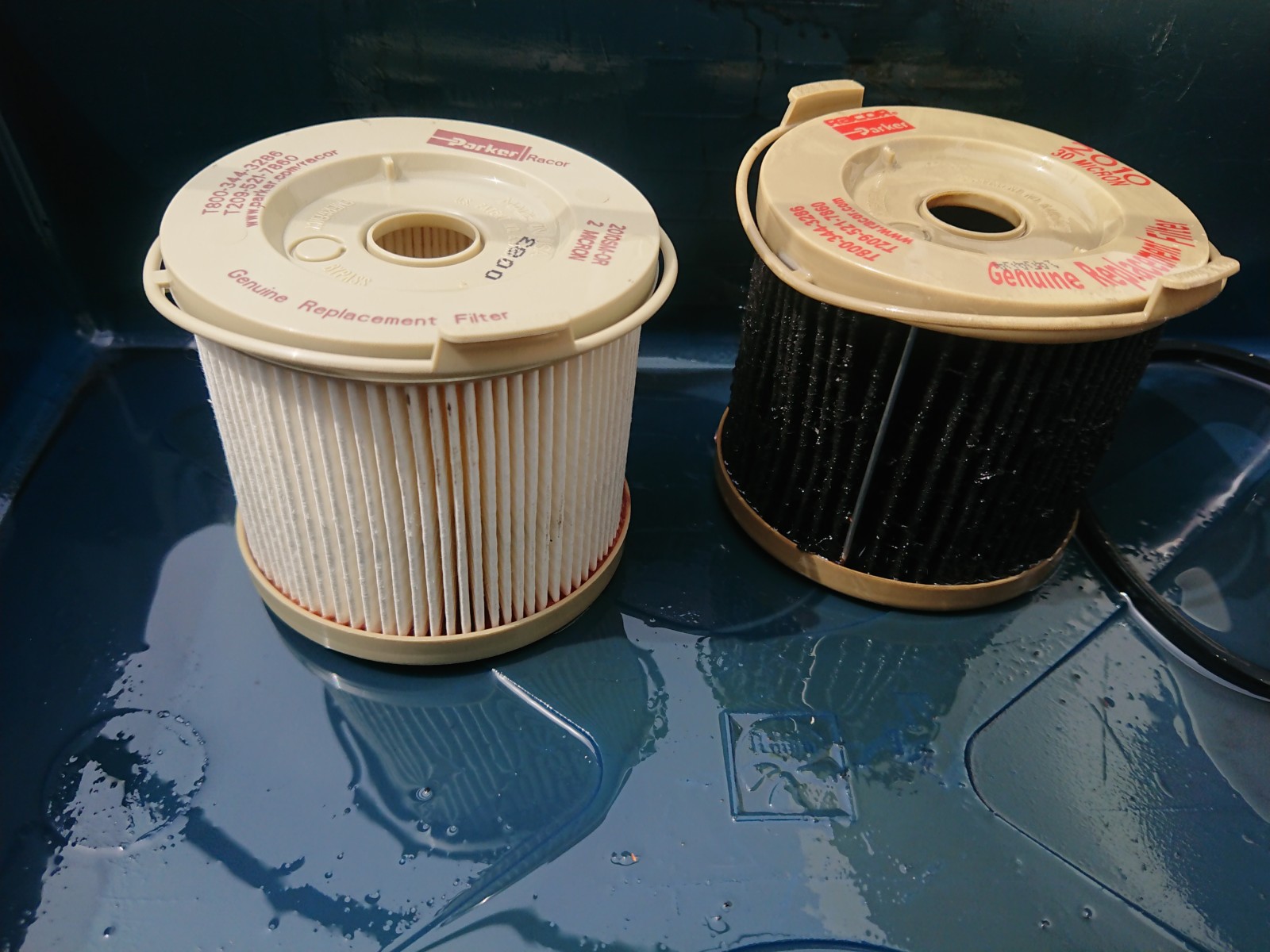 油水分離器のフィルターを交換しました。写真の右側のフィルターは汚れて黒くなってるのがわかります。定期交換が必要な部品なのでご注意下さい。