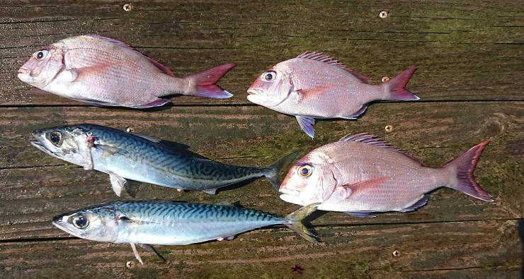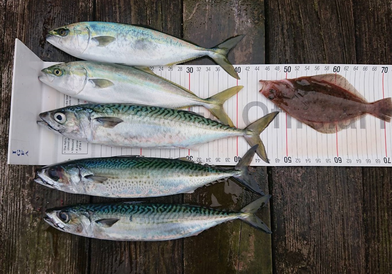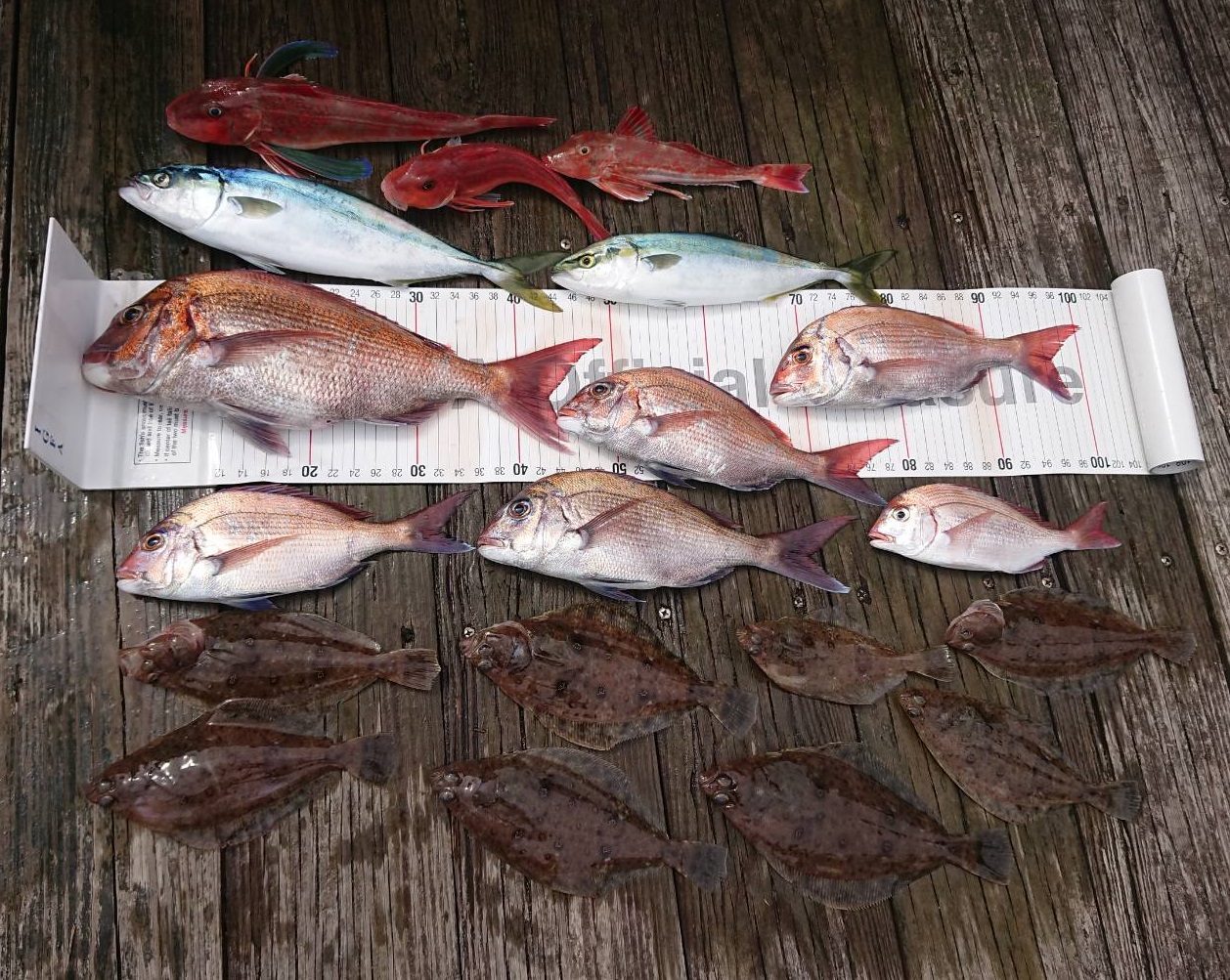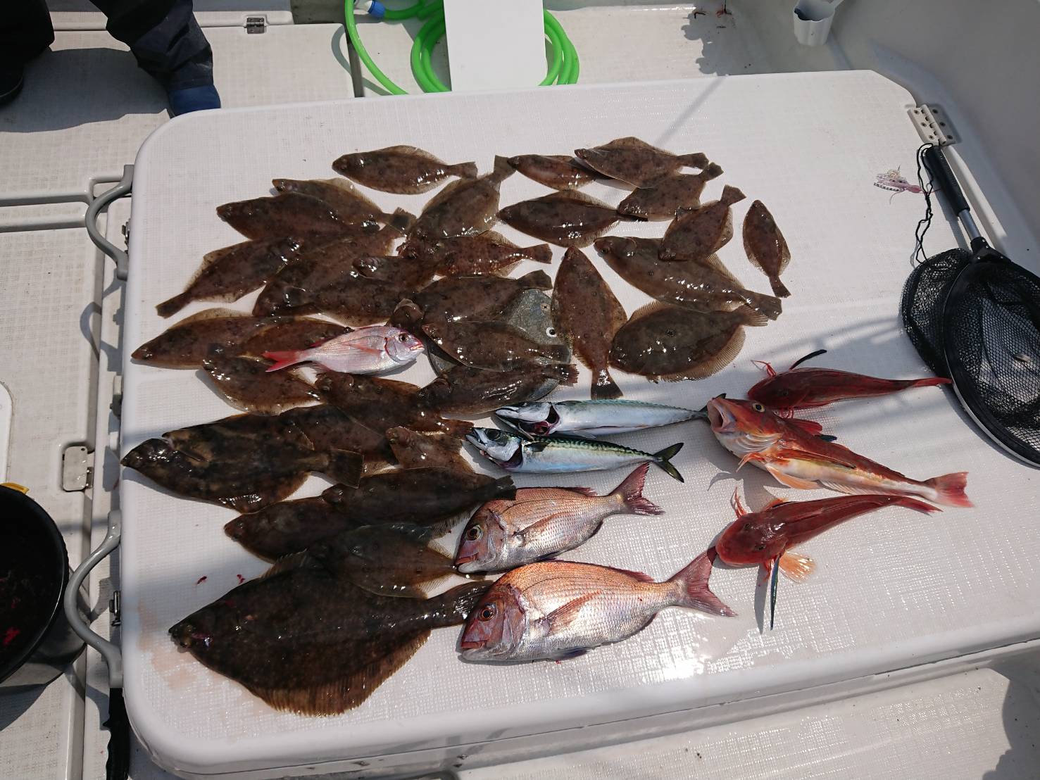 (ムシガレイ約40匹・マコガレイ・マダイ・ハナダイ・ホウボウ・サバ)