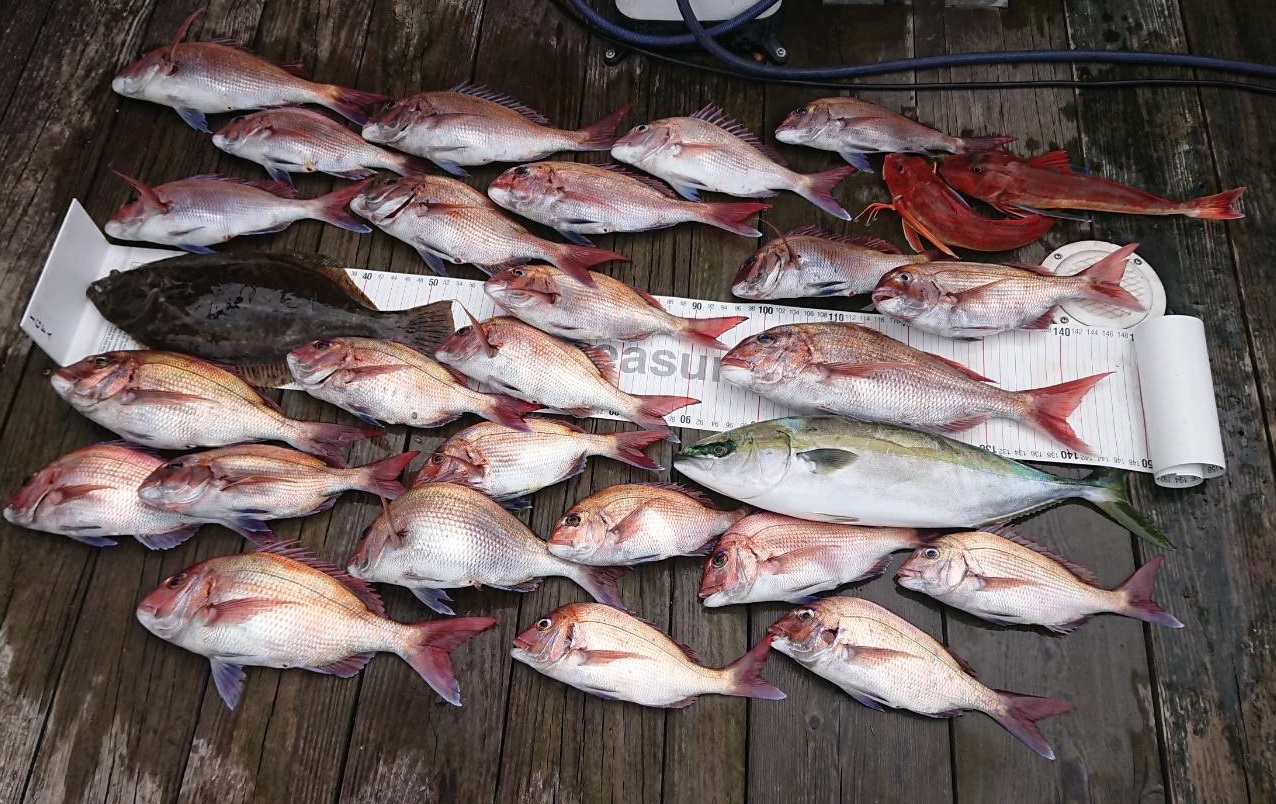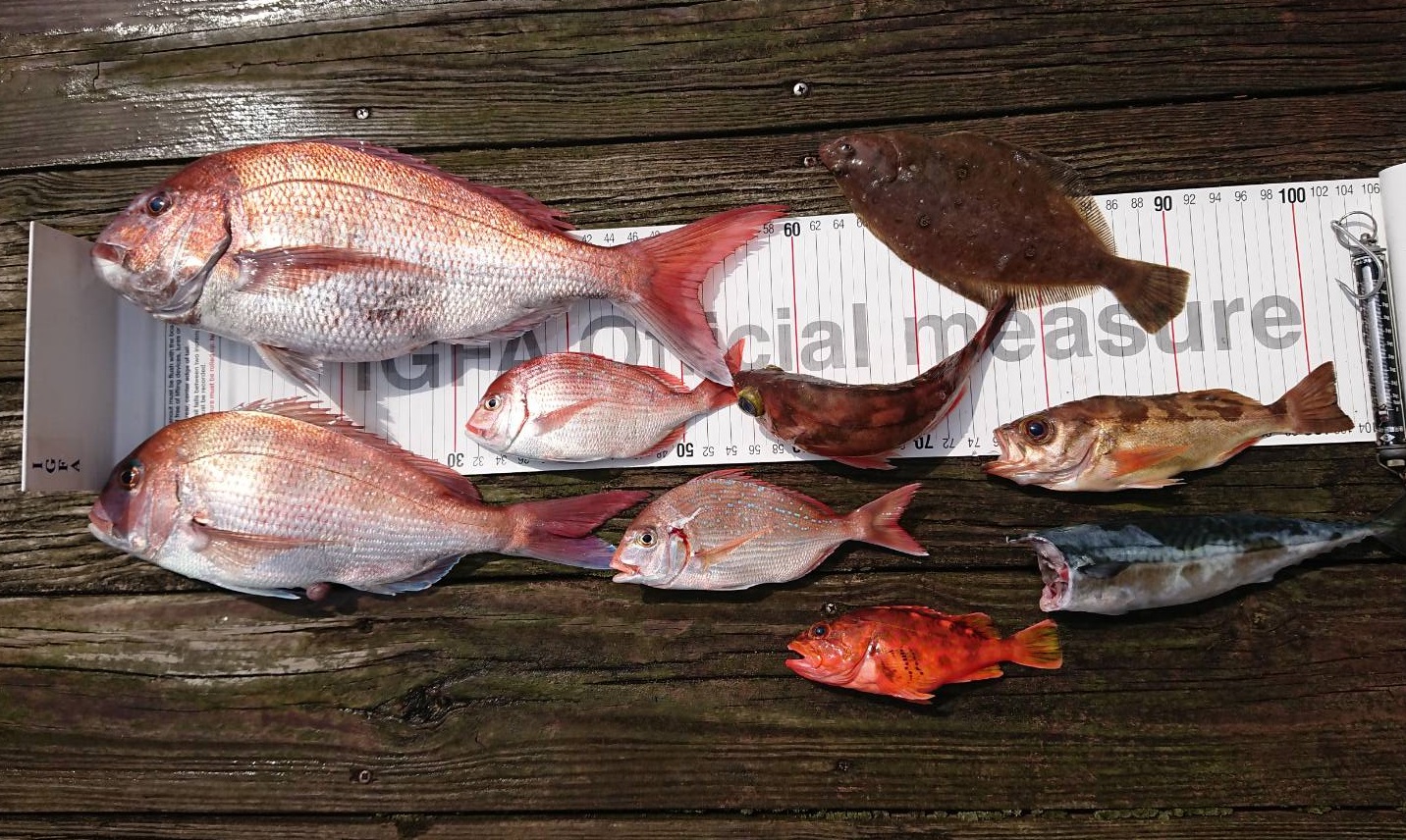 (マダイ3.5kg頭に50匹以上・トラフグ・ホウボウ・ソイ・メバル・サバ)