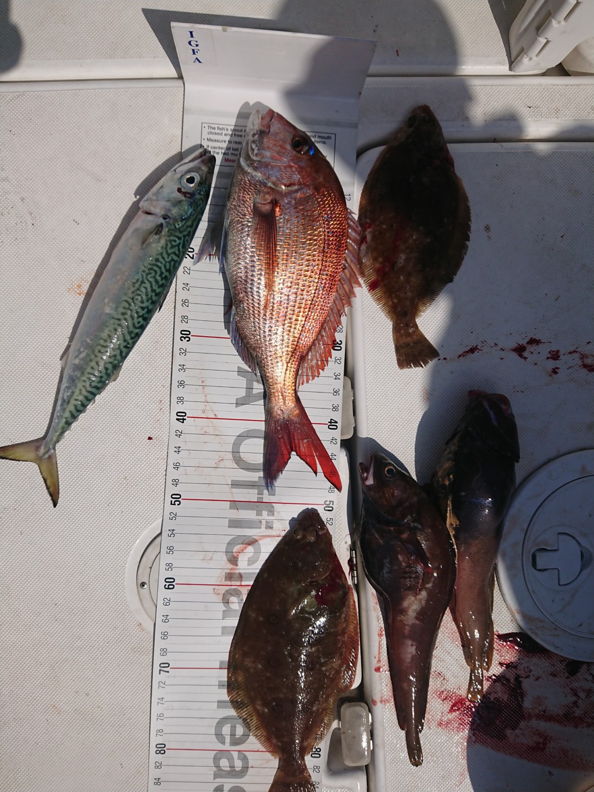 マダイ、5.3㎏頭、ワラサ4.9㎏、サバ、ソイ、ホウボウ、ヒラメ、カサゴ、タチウオ、トラフグ