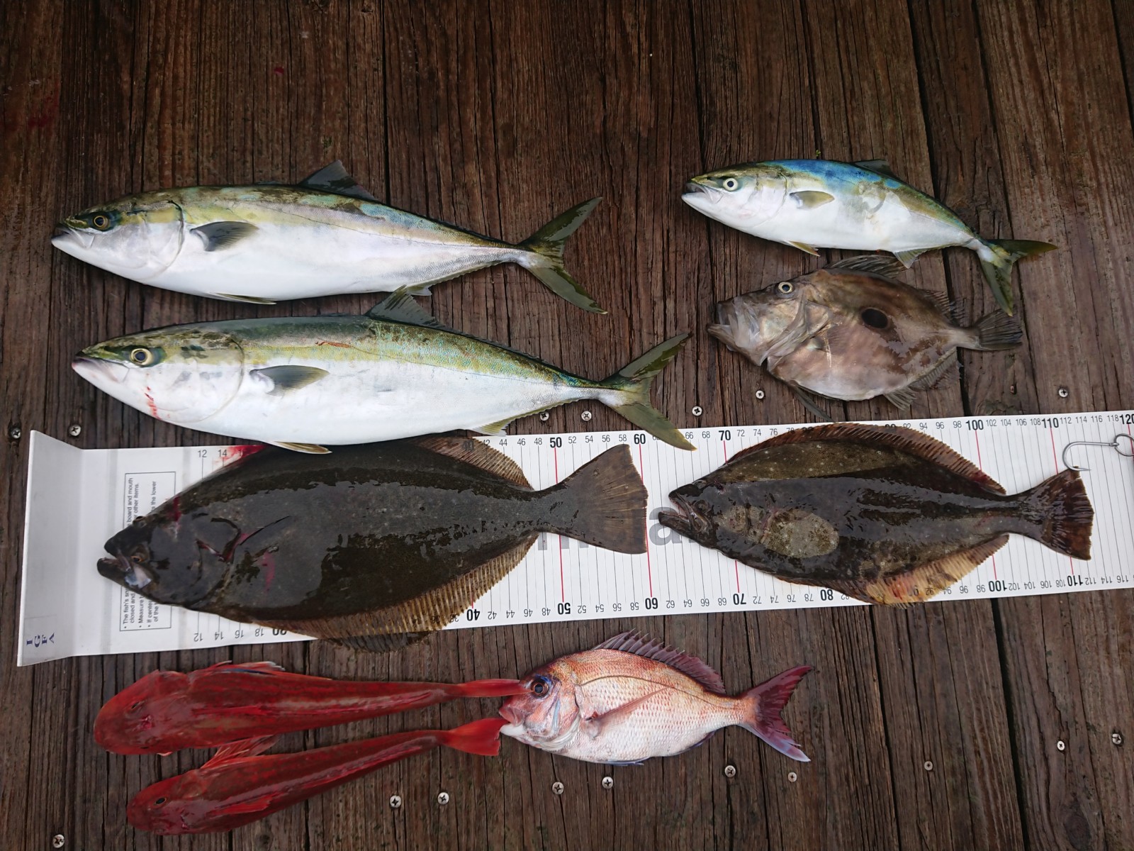 ワラサ3㎏、ヒラメ2㎏、ホウボウ、マダイ、マトウダイ